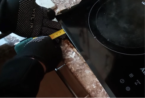 Нужно произвести замеры с помощью рулетки, зафиксировать их. Поверхность стекла, относительно варочной части, имеет больший габаритный размер. Стекло выступает на несколько сантиметров и эти данные нужно измерить и зафиксировать. Слева, справа, спереди.