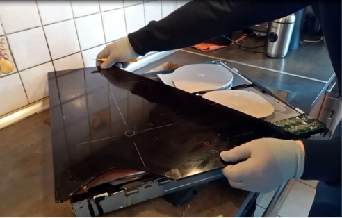 После этого необходимо извлечь варочную панель из столешницы. Пройдите канцелярским ножом по периметру под стеклом. Приподнимите за край и выньте ее из ниши. Панель нужно немного развернуть и поставить на столешницу.