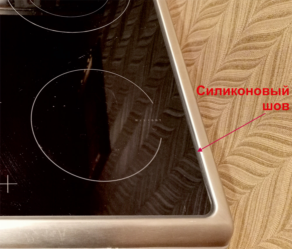 Второй вариант, мы называем его вклейка со швом. Чаще всего встречается в отдельно стоящих плитах или зависимых варочных панелях. Характеризуется тем, что стекло укладывается в рамку с зазором. Зазор заполняется силиконом, чтобы различные жидкости не проникали во внутреннюю часть. В данном варианте силикон используется дважды, 1 - стекло приклеивается снизу к внутренней рамке (ступеньке) и 2 - дополнительно герметизируется силиконом по периметру стеклокерамики между стеклом и видимой частью рамки. В процессе эксплуатации шов часто бывает засален и не всегда с ходу можно определить, уходит стекло под рамку или же это вариант "со швом". В таком случае для определения вашего варианта ("со швом" или под рамку) рекомендуется острым предметом (тонкий нож или зубочистка) попытаться проткнуть это место рядом с рамкой, если зубочистка/нож проваливаются в силикон – у вас вариант "со швом".